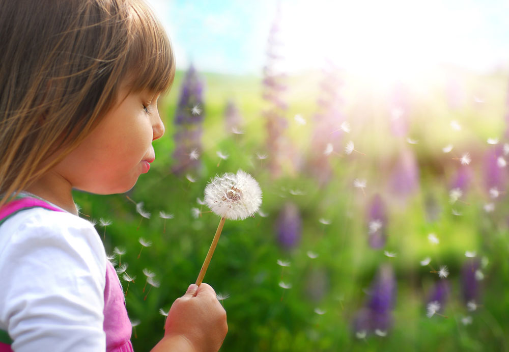 蒲公英努力地开,女孩努力地笑。