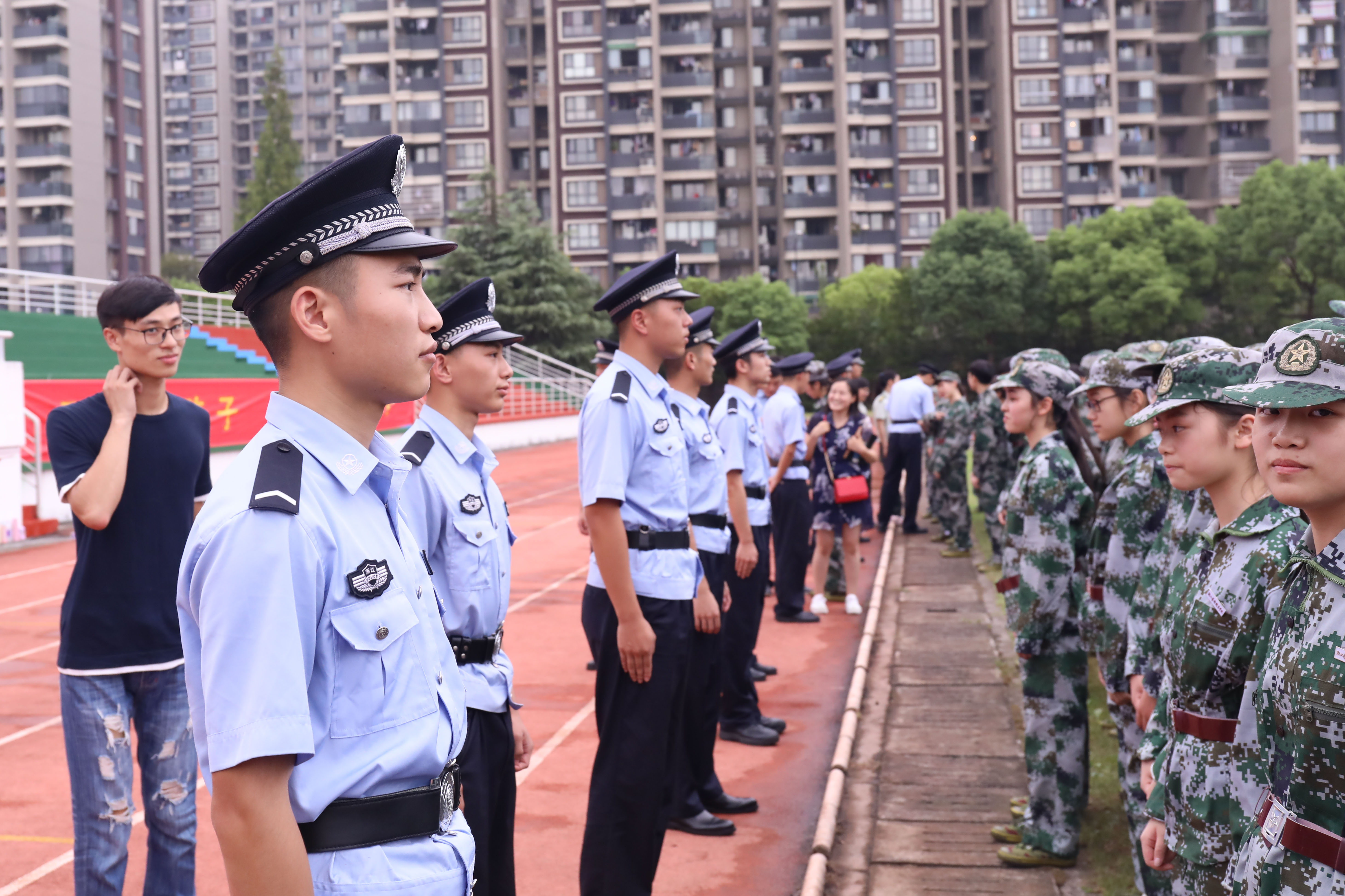 典礼在庄严的升国旗仪式中拉开帷幕。朱海闵作开学典礼暨军训动员讲话,她首先代表浙艺全院师生员工对浙江警察学院的领导及全体教官表示诚挚的感谢,同时对跨入浙艺学习的300多名新同学致以热烈的欢迎和衷心的祝贺。她讲到,同学们所就读的戏剧影视表演、音乐表演和舞蹈表演等专业一直是学校的品牌,是浙江省的重点专业和优势特色专业,戏曲表演(越剧)专业还被文化部、教育部和国家民委评定为首批“全国职业院校民族文化传承与创新示范专业点”,2017年学校成功入选了浙江省优质高等职业院校建设计划。她希望同学们尽快融入浙艺大家庭,以浙艺前辈名师和群星璀璨的优秀毕业生们为榜样,在浙艺开启梦想,在学艺的同时培养自己良好的政治素质、道德品质、法治意识和行为习惯,培育自己积极健康的人格和良好心理品质,热爱党热爱祖国热爱人民,自觉践行社会主义核心价值观,不断增强文化自觉和文化自信,成为一名有家国情怀、社会责任和真才实学的合格人才。朱海闵对新生军训提出了几点要求:尊重教官,严格训练,战胜困难;思想上高度自觉,行动上雷厉风行;要坚决服从管理,自觉锤炼毅力意志,以一名军人的标准严格要求自己;团结协作,互帮互助,以饱满的精神和认真的态度参加军训,取得入学第一课的优异成绩。