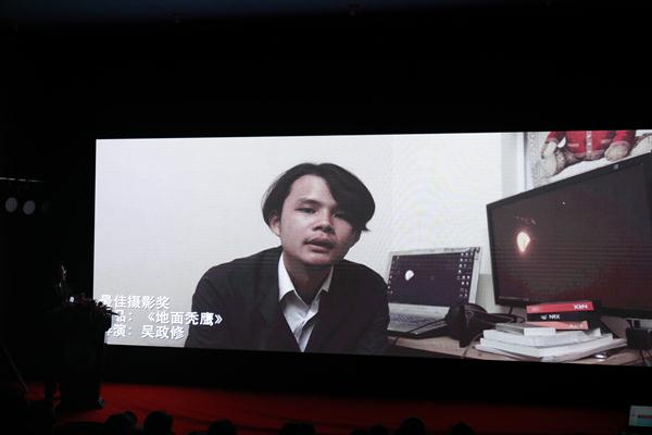首届浙艺金鹄电影节暨原创影像大赛颁奖典礼分为“走红毯送祝福”“获奖感言分享”“嘉宾颁奖”三个环节。走红毯送祝福”环节,主持人随机对到场的嘉宾进行了采访,嘉宾纷纷为“金鹄”展翅送出了美好祝福。在“获奖感言分享”环节,各个单元的获奖选手将收获荣誉的心情第一时间与大家分享,短片单元《地面秃鹰》的导演——来自台湾东方设计大学的吴政修同学从台湾发来获奖感言,他在视频中感谢金鹄电影节给予他与他的创作团队一次证明自己的机会,并勉励与他们一样正在创作路上前行的团队,一定要坚持下去,只要坚持创作总有一天会被人看到,会发光发亮。