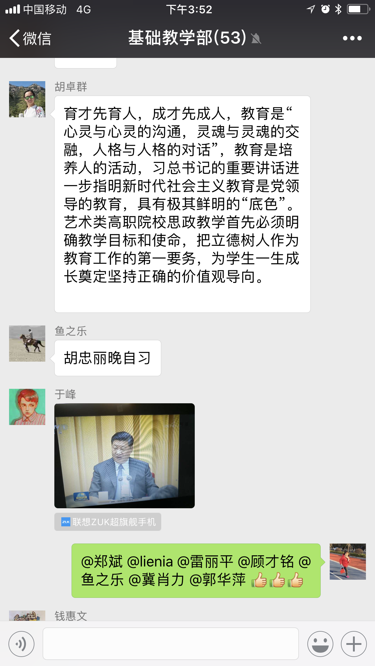 戏剧系党总支副书记许瑛表示,习近平总书记在全国教育大会上的讲话激动人心、催人奋进。“百年大计,教育为本; 民族复兴,教育先行。”作为教育工作者,我们要深刻学习领会讲话精神,紧紧围绕培养中国特色社会主义合格建设者和可靠接班人的根本任务,把马克思主义信仰作为鲜亮底色,以立德为基础,以树人为根本,以文化人,以文育人,为建设教育强国,传承中华优秀传统文化同心同德同向同行,为培养文艺新人聚识聚心聚智聚力,为学院高水平建设,高质量发展谋新篇创新业新作为。