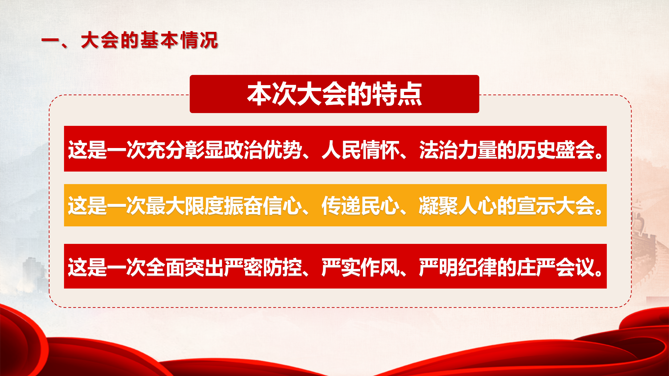 郑亚莉首先宣讲了全国人大十三届三次会议的基本概况。她介绍,受新冠肺炎疫情影响,十三届全国人大三次会议推迟召开,这是改革开放40多年来的第一次。她传达了会议期间习近平总书记先后参加内蒙古、湖北、解放军和武警部队代表团的讲话精神,李克强总理所作的政府工作报告,栗战书委员长所作的全国人大常委会工作报告,以及最高人民法院和最高人民检察院工作报告等。她表示,今年的两会是一次充分彰显政治优势、人民情怀、法治力量的历史盛会,是一次最大限度振奋信心、传递民心、凝聚人心的宣示大会,也是一次全面突出严密防控、严实作风、严明纪律的庄严会议。