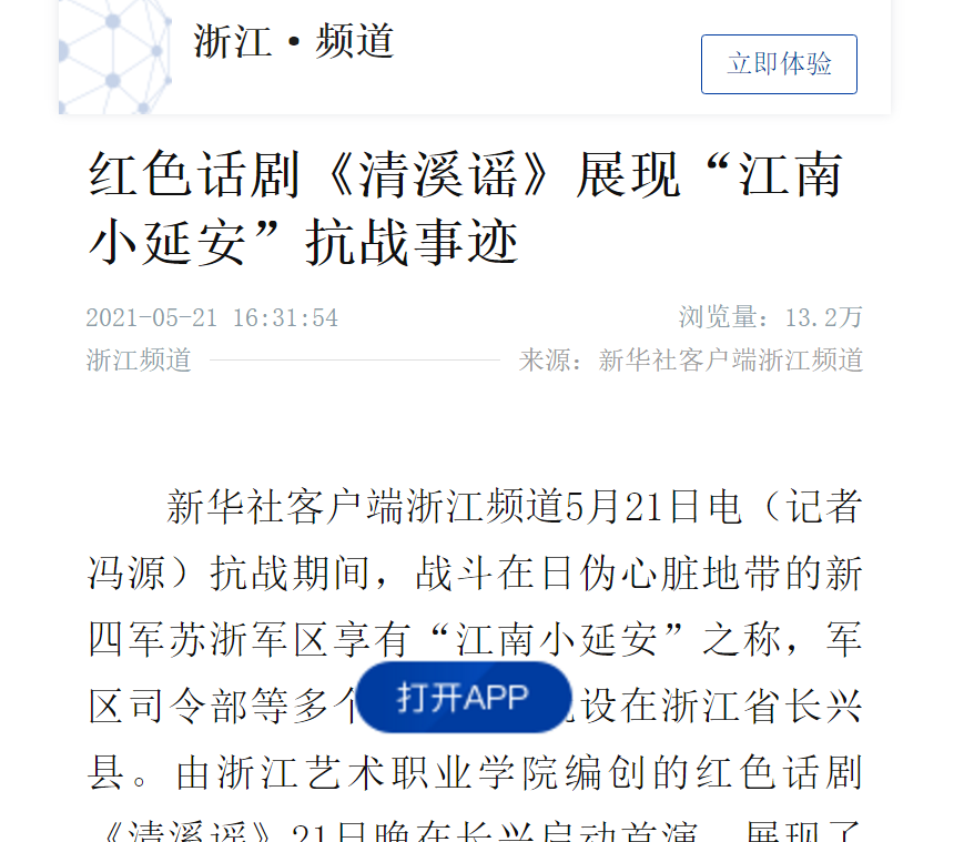 新华社客户端浙江频道:红色话剧《清溪谣》展现“江南小延安”抗战事迹