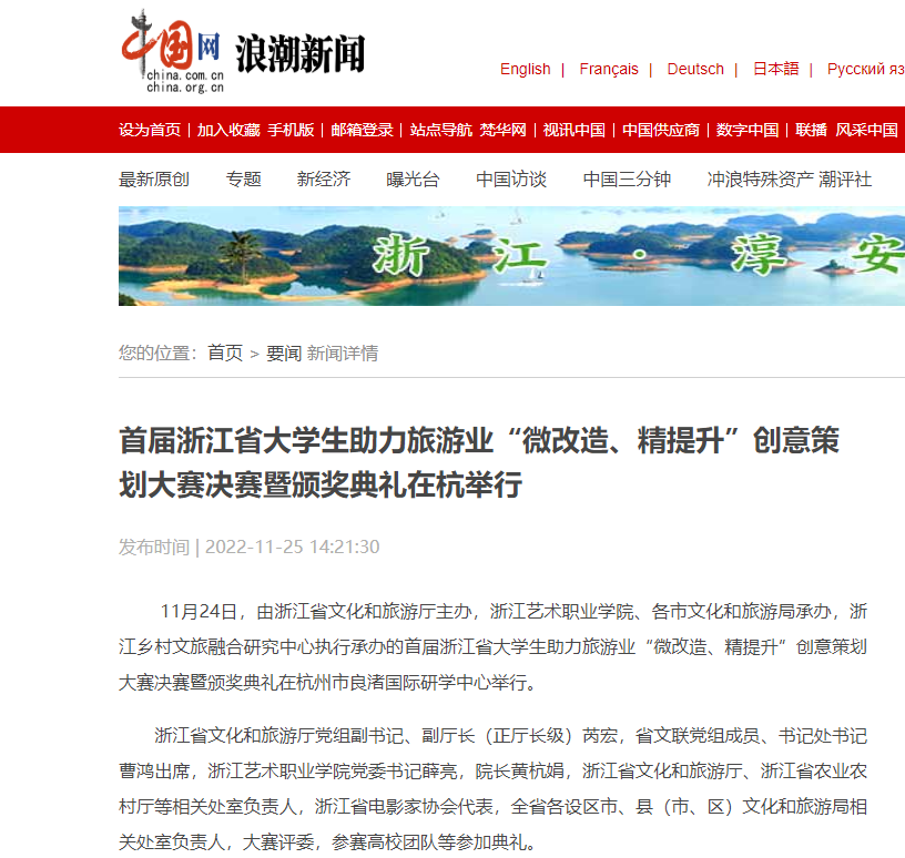 中国网浪潮新闻:首届浙江省大学生助力旅游业“微改造、精提升”创意策划大赛决赛暨颁奖典礼在杭举行