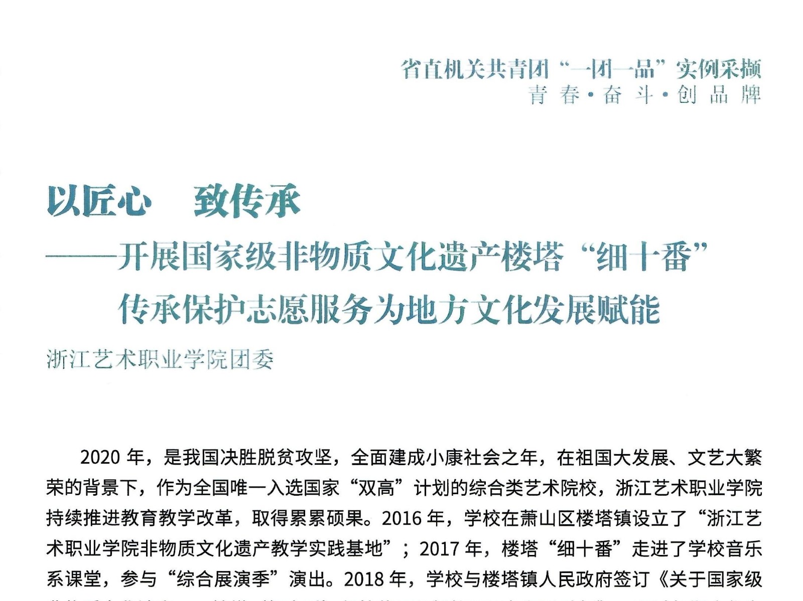 20年来,志愿服务作为学校三全育人体系中的重要抓手,已然成为校园精神文明建设、学生思想教育、人才培养、服务社会等工作重要的前沿阵地,青年师生服务的脚步深入全省各地,到达了云南省最后“脱帽”的贫困县,逐渐形成校党委统一领导,校团委牵头负责,各部门通力合作的工作模式,先后获得全国大中学生暑期社会实践优秀团队、浙江省优秀文化志愿服务团队、浙江省优秀文化志愿服务项目等荣誉,服务项目入选国家文化和旅游部文化艺术职业教育和旅游职业教育提质培优行动计划,两次被浙江省直属机关团工委作为“一团一品”实例采撷推广。