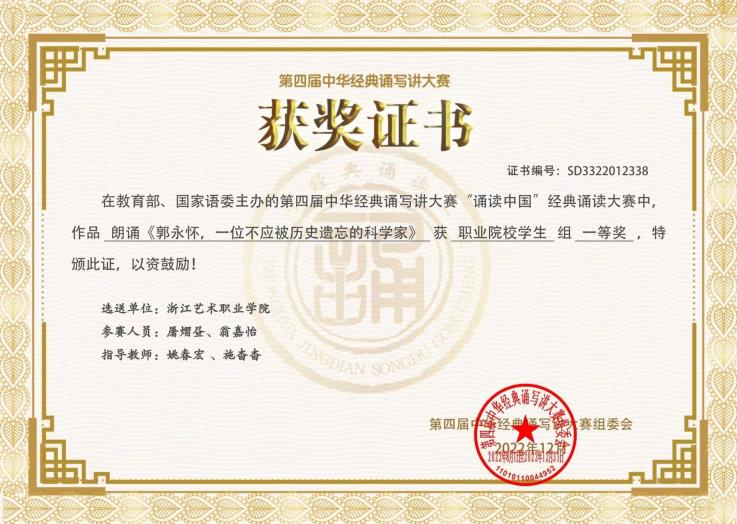 喜报|浙艺师生荣获第四届“诵读中国”经典诵读大赛一等奖