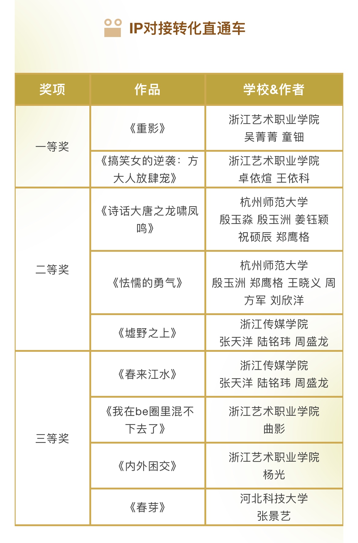 本届金鹄青年电影节共收到来自清华大学、北京电影学院等200所国内外院校的1296件参赛作品,最终有285部作品成功入围。最终,由评委会评选出5个单元的77个奖项以及10个最佳组织单位。具体获奖名单如下: