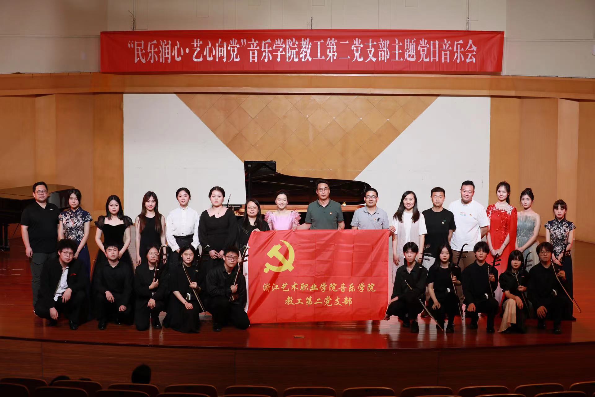 教工第二党支部与民乐教研室、附中教研室、音乐剧和现代音乐教研室联合举办“民乐润心 艺心向党”主题音乐会。通过音乐会的形式,演奏红色主题作品,展现师生专业风采,奏响“奋斗新征程 建功新时代”的时代华章。翁曹梦、陈雨文两位同学演奏柳琴二重奏《弹起我心爱的土琵琶》,乐曲作为电影《铁道游击队》插曲,极具感染力,深刻地表现了中国人民不畏强暴、抗击侵略的爱国主义精神和勇于革命的乐观主义精神,获得了同学们的一致好评。丁诗翊演奏的琵琶独奏《唱支山歌给党听》,乐曲通过深情-悲怆-激昂的情绪跌宕,深情表达出对党的歌颂。笙重奏《沂蒙山歌》由王泽园、俞腾共同演绎,表现了沂蒙山区人民对家乡的热爱和赞美。冯夕芮演奏的古筝独奏《井冈山上太阳红》,曲目朴实亲切、贴近生活,洋溢着红军在革命斗争中的乐观主义精神。笛子二重奏《送红军》由王添铄、林静雯共同演奏,音乐舒展豪放,旋律优美、朴实,表现了沂蒙山区人民对家乡的热爱和赞美之情。古琴、小提琴重奏曲《映山红》由姚星彤和张瀚之共同合作完成,作品用悦耳动听的旋律向人们诠释了对红军英雄的无限热爱与不舍之情。压轴曲目——二胡齐奏《赛马》,由王识博、曲浩添等八位同学共同演绎,演奏气势磅礴、激昂热烈,奔放的旋律更是将音乐会推向最高潮,迎来了同学们的热烈掌声。