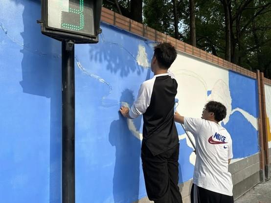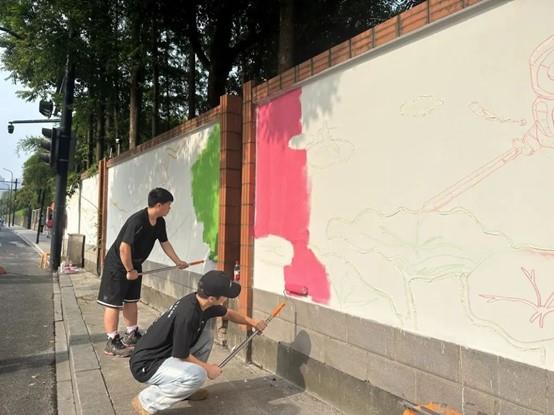 为深入学习贯彻习近平新时代中国特色社会主义思想主题教育,充分发挥高校与社区的合作效能,进一步深化落实党建共建机制,依托专业优势赋能亚运、添彩亚运,6月13日-6月16日,设计学院与滨文社区联合开展“一起来涂‘亚’”墙绘活动。设计学院学生党支部、舞台艺术设计与制作专业师生参加。