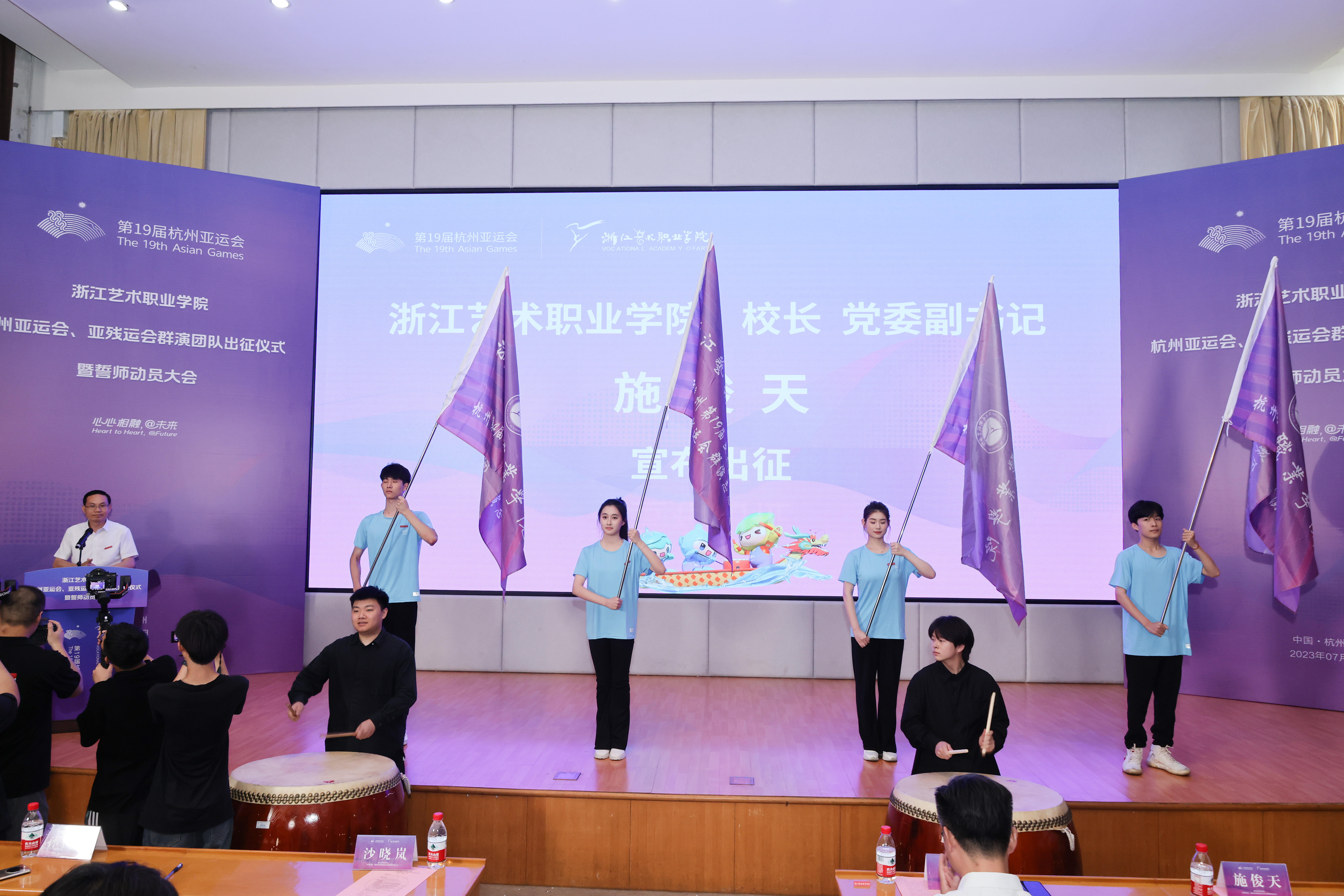 杭州亚运会开幕式总制作人、亚运会闭幕式、亚残运会开闭幕式总导演沙晓岚,杭州亚运会、亚残运会开闭幕式指挥中心仪式演出专班负责人孙俊明,杭州亚运会、亚残运会开闭幕式指挥中心仪式演出专班群演保障组主任沈晓峰,亚运会开幕式制作人、亚运会闭幕式、亚残运会开闭幕式总制作人吴艳,校领导薛亮、施俊天、夏开堂、沈军甫、支涛出席誓师大会。誓师大会由校党委副书记夏开堂主持。