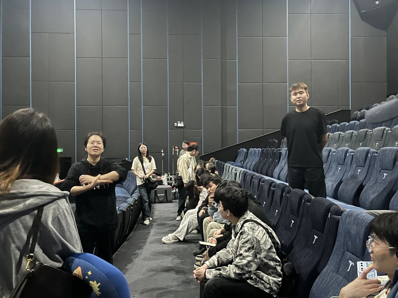 杭州金逸影城(华夏之心美瑭IMAX店)曹高阳店长和12级电子声像技术班帅银丽副店长,详细介绍了影城的管理及运营模式,并带领同学们参观IMAX厅、VIP厅以及激光厅。她们详细介绍了三个厅的设备区别、电影院使用投影设备和声音系统的类型、路演活动的安排,以及如何基于市场需求进行排片、如何维持电影院的日常运营等。他们强调,要时刻关注观众的需求,及时调整影片排期、优化观影体验与服务,以此提升观众满意度并维持良好口碑。