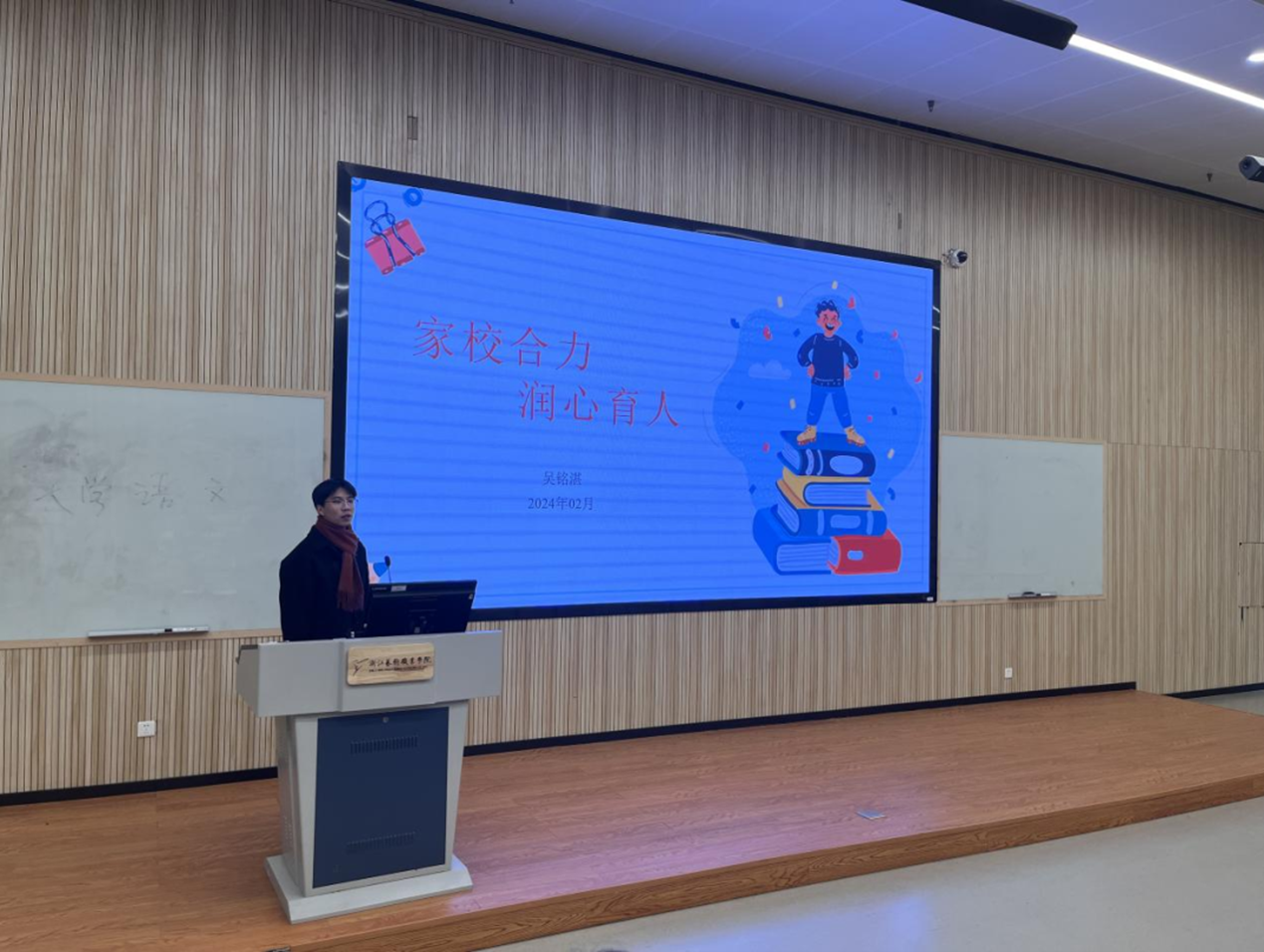 辅导员吴铭湛解读了对学校近期颁布的学生管理相关制度,并从调节心理状态的角度出发,对家长应怎样把控学生情绪问题进行深入讲解,帮助学生更好地适应校园生活。